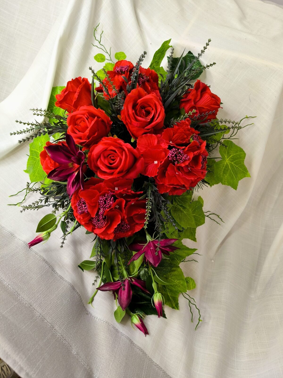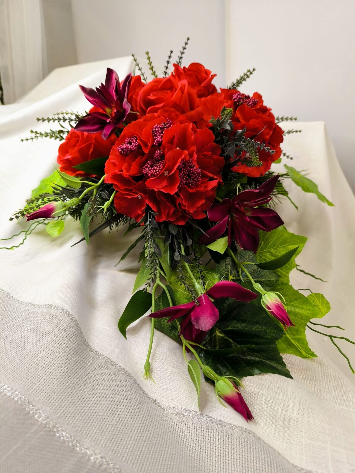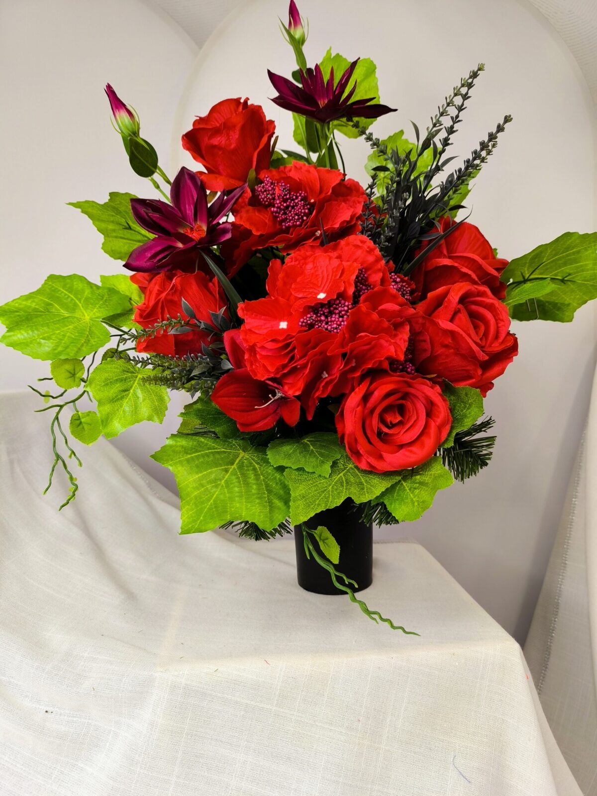 Kompozycja, utrzymana w głębokich odcieniach czerwieni, symbolizuje miłość i pamięć. Główne elementy florystyczne to hortensje, róże i clematis. Każdy z tych kwiatów został starannie dobrany, aby stworzyć harmonijną, estetyczną całość. Czerwień kwiatów podkreśla wyjątkowość zestawu i stanowi wyraz szacunku oraz hołdu dla bliskich, którzy odeszli.