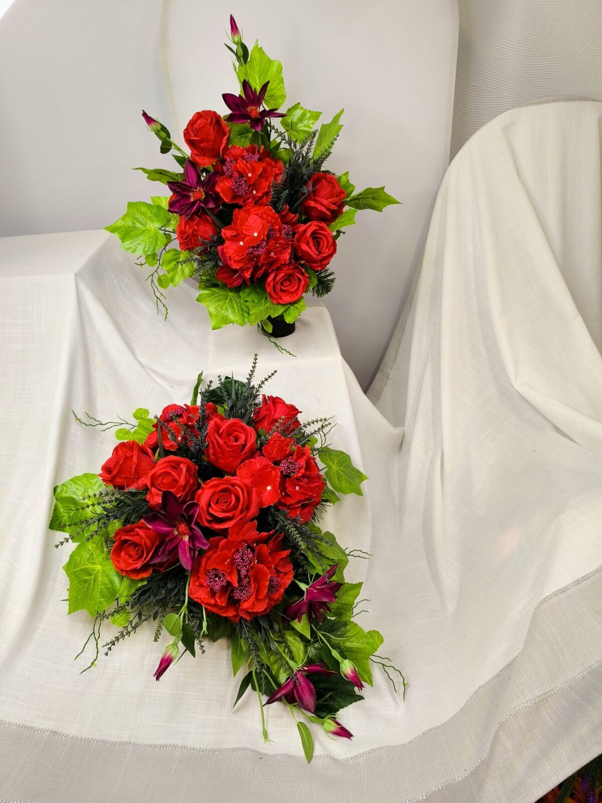 Kwiaty premium, z których wykonano komplet, nie wymagają szczególnej pielęgnacji, a dzięki trwałości materiału doskonale znoszą różne warunki pogodowe. Dekoracja zachowuje swój piękny wygląd przez długi czas, co pozwala cieszyć się jej estetyką bez konieczności częstej wymiany.