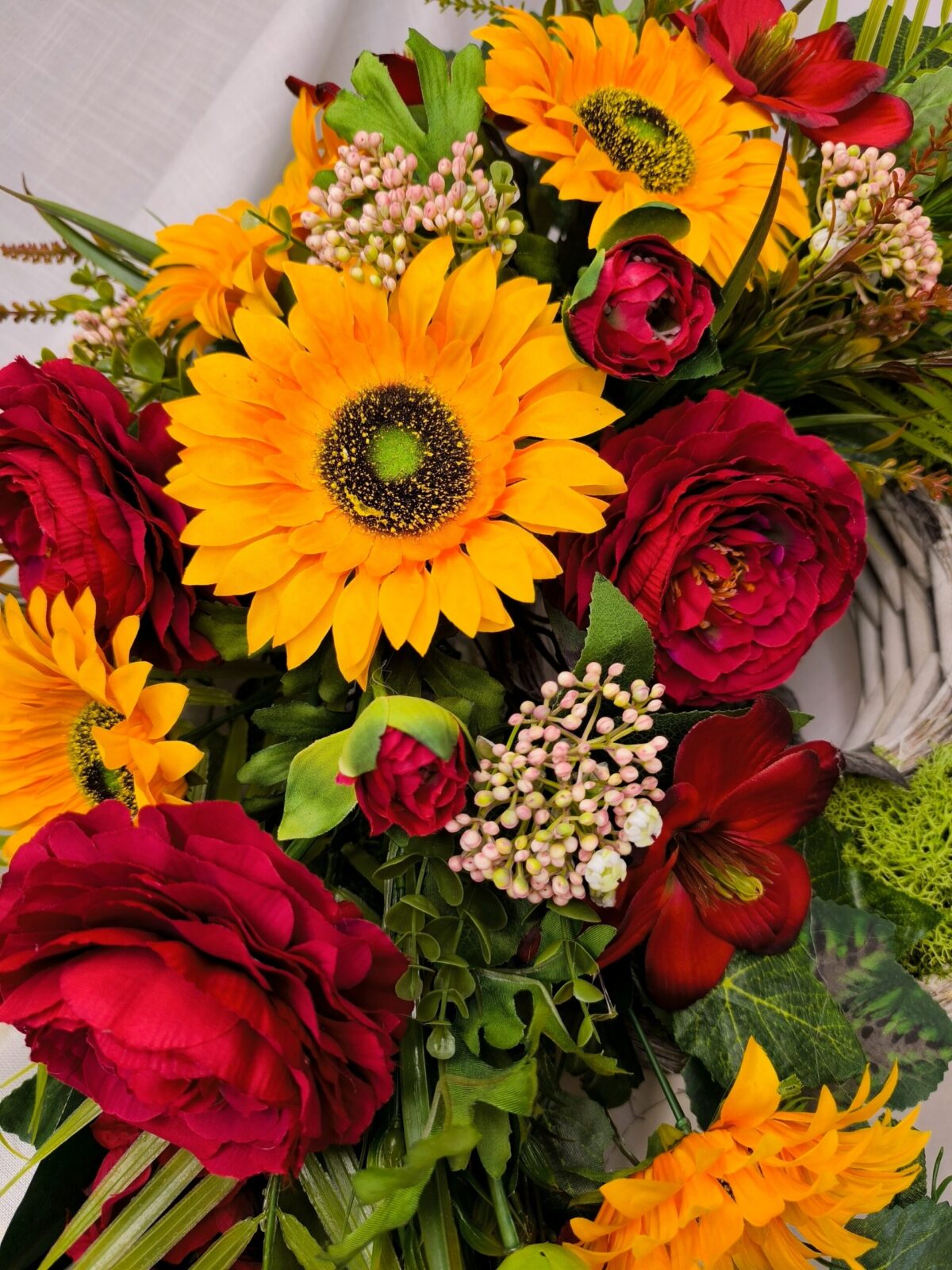 Kompozycja nagrobna na kole w kolorach lata to elegancka dekoracja na grób, która przynosi wspomnienia ciepłych dni. Główną rolę odgrywają tu słoneczniki, które symbolizują radość i optymizm. Obok nich znajdziesz delikatną lewkonię oraz elegancką różę, które dodają kompozycji subtelności. Wszystkie kwiaty ułożono w półkole na bielonym, okrągłym koszu, co tworzy harmonijną całość.